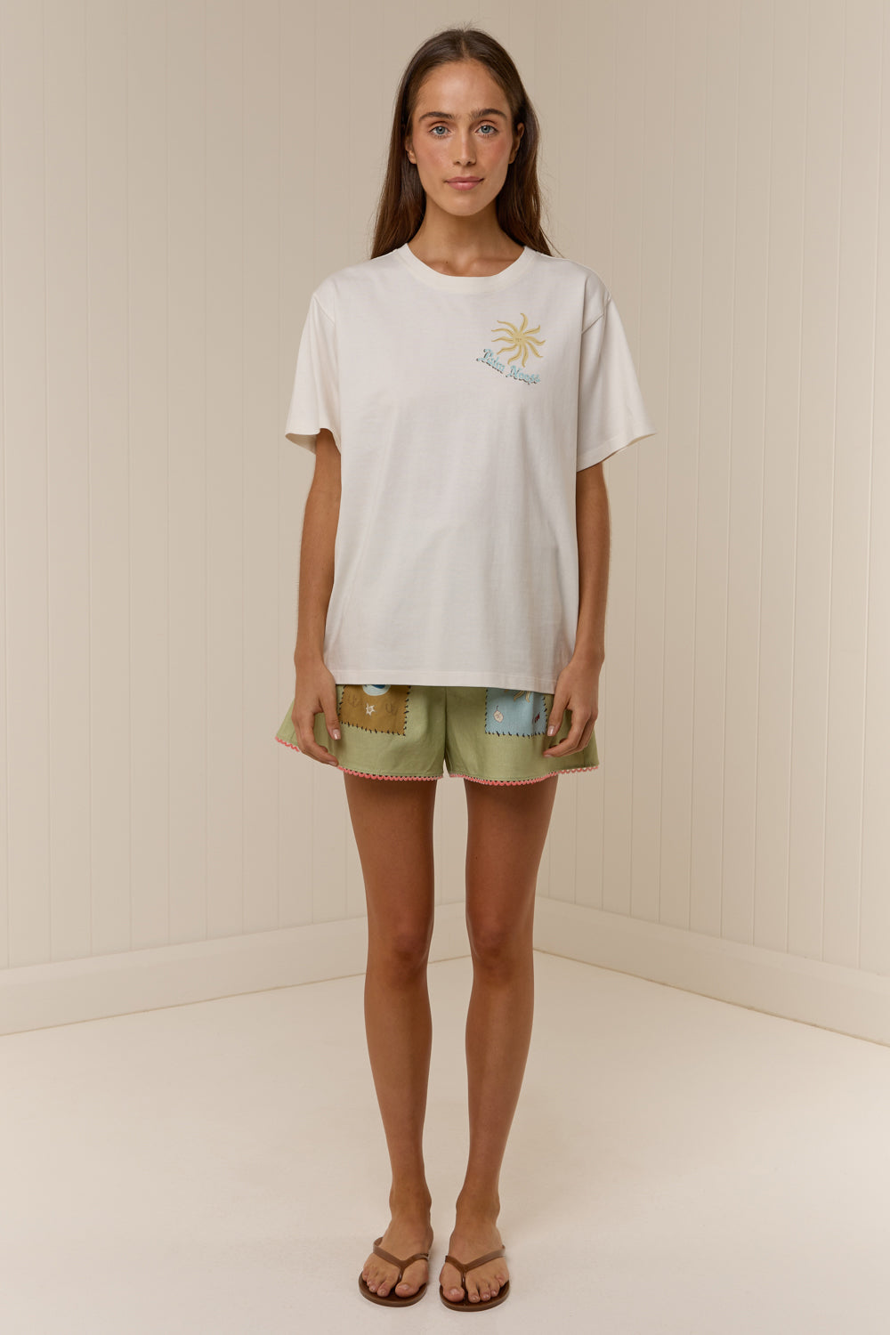 The Maya T-Shirt is crafted from 100% Cotton, with a relaxed, boxy silhouette—ideal for layering over swimwear or styling casually. We recommend purchasing your standard size for a relaxed fit. Please refer to our size and fit guide for further fit details.