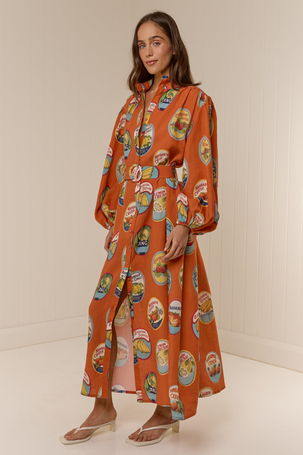The Noddy Dress in our exclusive La Fruta print is crafted in a premium linen. The Noddy Dress is designed as a relaxed maxi dress silhouette. Featuring blouson sleeves with elasticated cuffs and centre front button detailing. The Noddy Dress is designed to hang loosely from the body, and has matching buckle belt to bring in the waist. Please refer to our size and fit guide for further fit details.