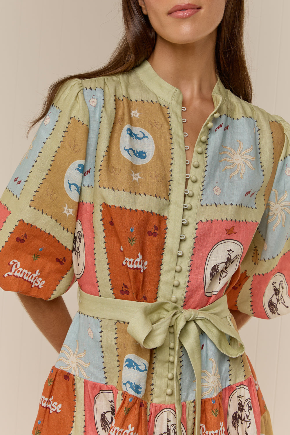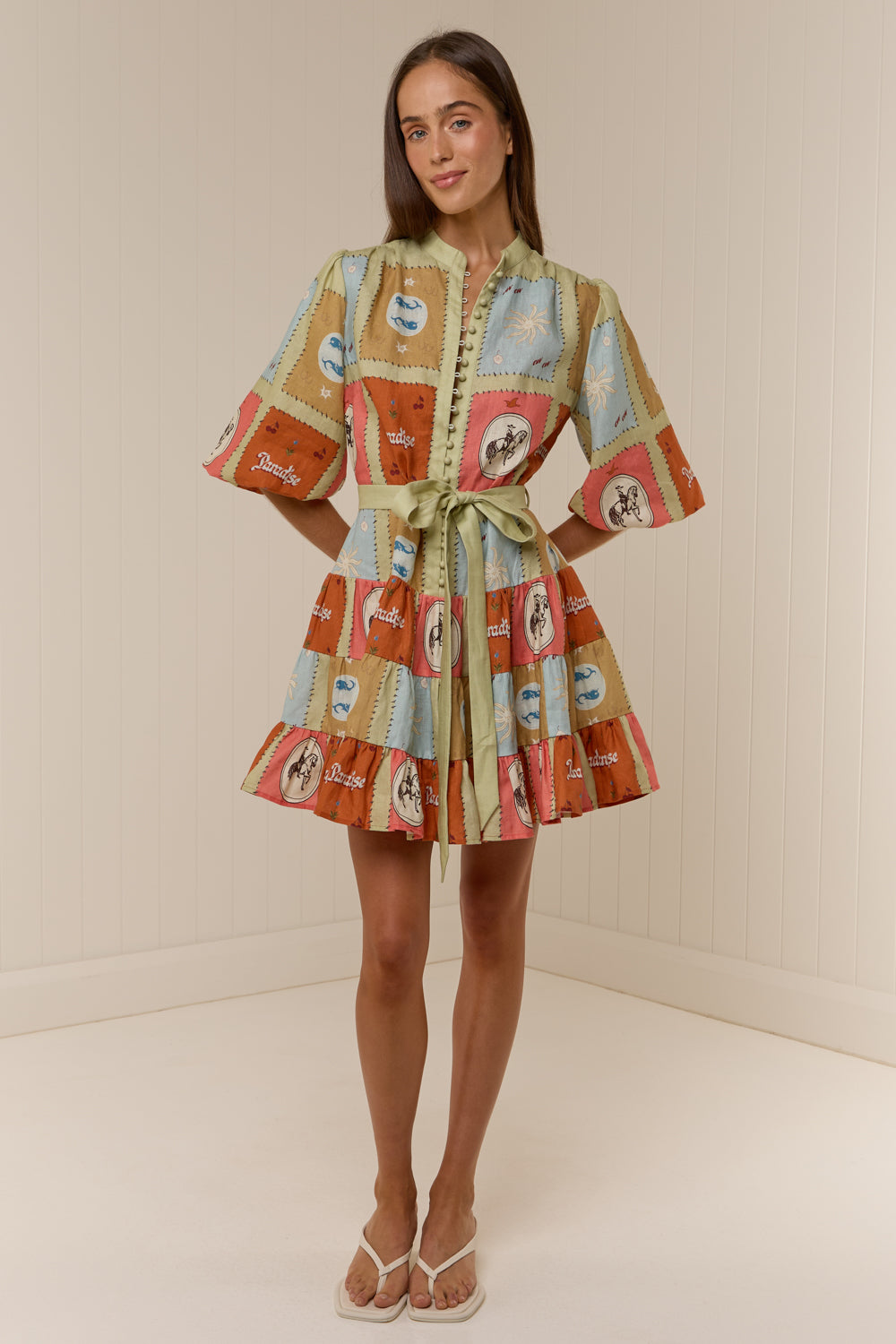 The Ruba Mini Dress in our exclusive Maya Tile print is a new mini silhouette crafted in a premium Linen. Designed to be fitted across the shoulders, then loosely sit off the body through the bust and waist, the Ruba Mini Dress features a centre front functional button detailing, blouson half sleeve, drop waist tiered mini skirt and a sash belt to cinch the waist for an elevated feminine fit. Please refer to our size and fit guide for further fit details.
