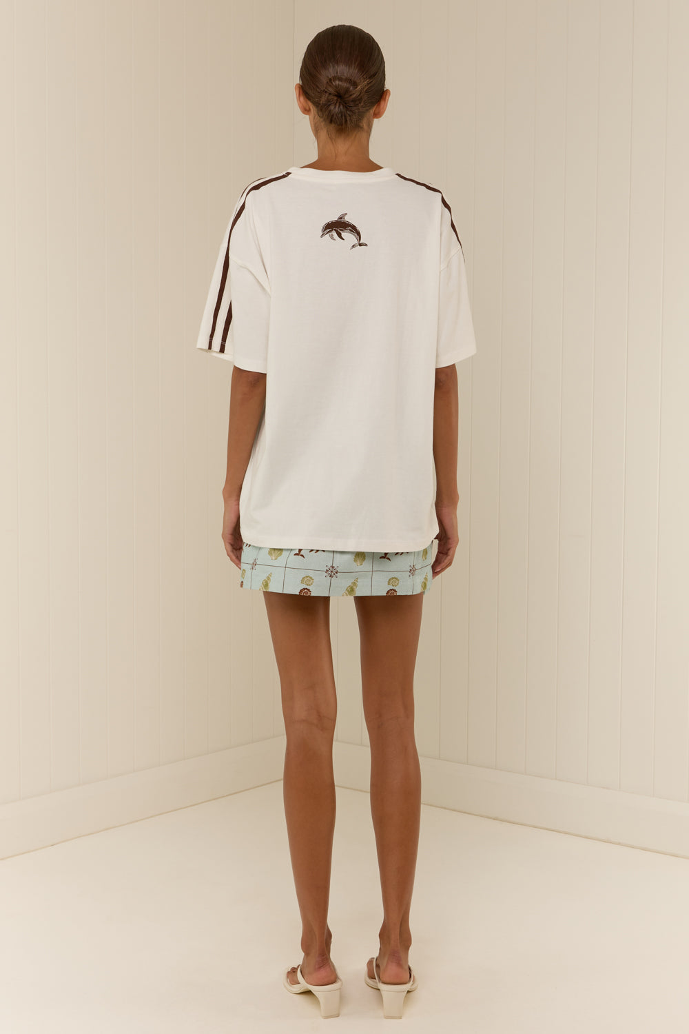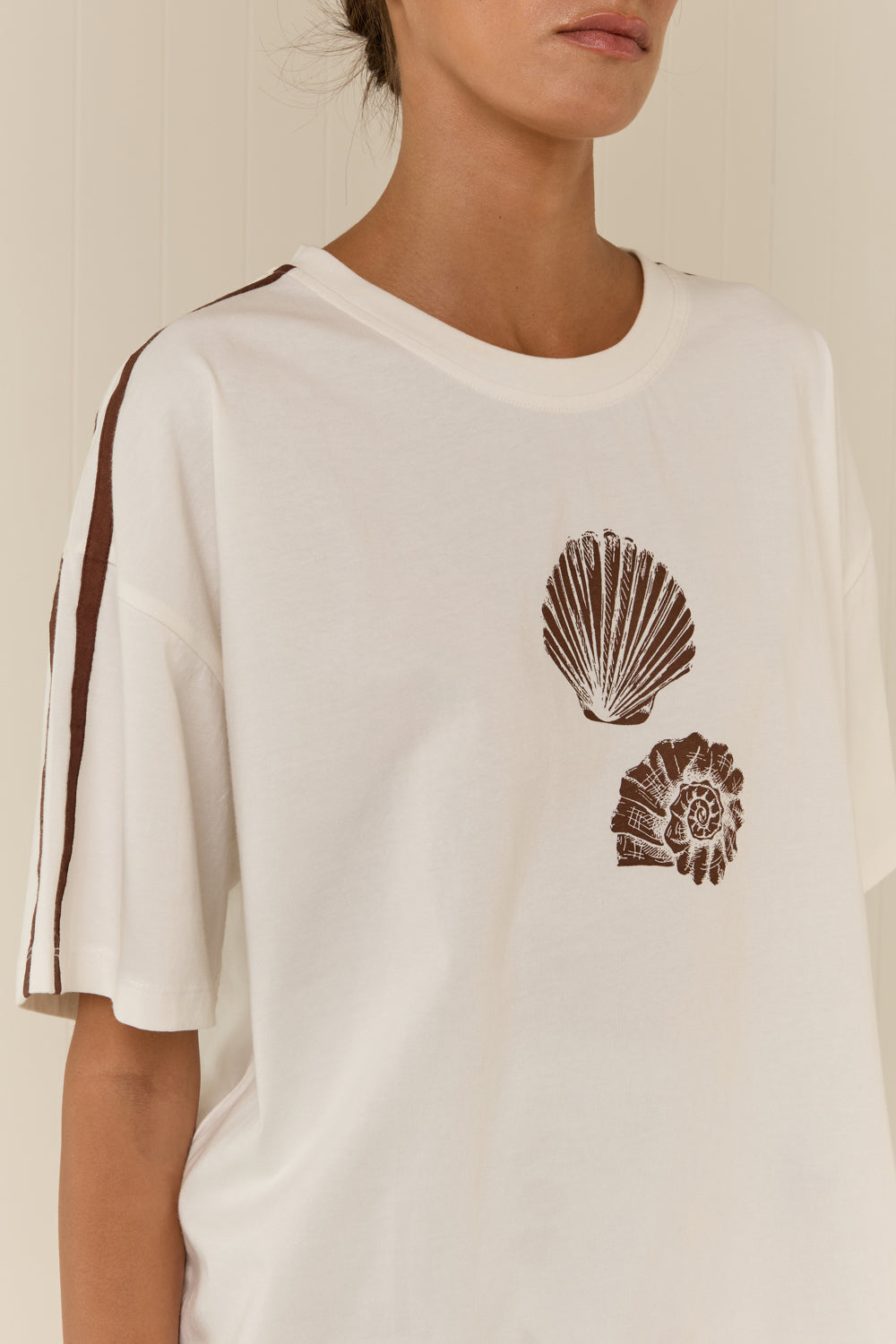 Rossana is wearing a size S and is 180cm tall with a 77cm bust and a 58cm waist. The Seashell T-Shirt is an oversized fit. For a relaxed boxy fit similar to Rossana, we recommend purchasing your standard size. Please refer to the size chart linked above for standard body measurements.